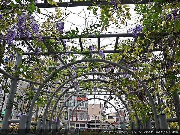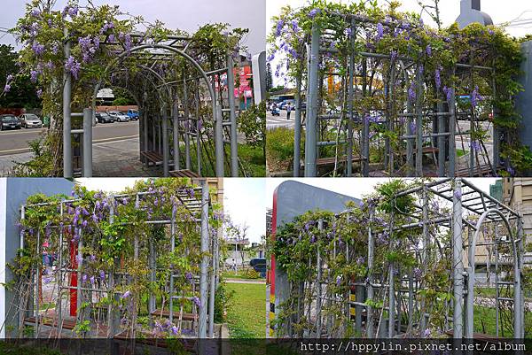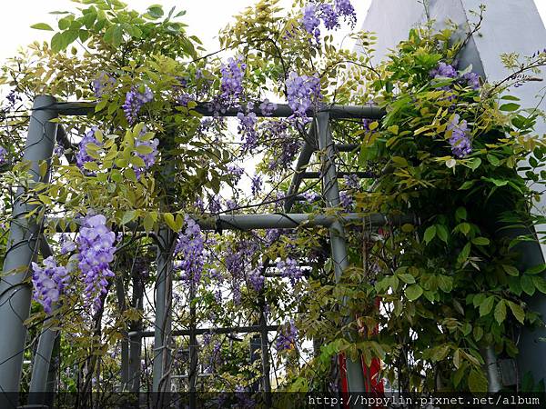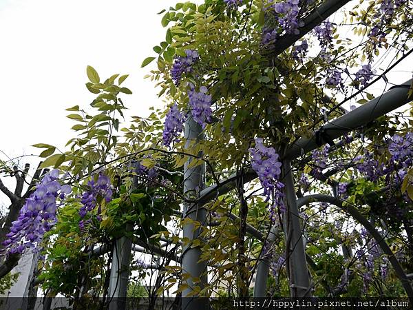 某天和母親去新竹觀音亭拜拜回家,赫然發現路邊有三座拱門開滿了紫藤花,當然立刻下車,拿起手機拍,但覺得不過癮,隔天帶著單眼又來拍了一次~^^
