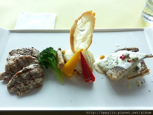 碳烤小里肌(蕃茄沙司)佐碳烤海鱸魚佐酸豆白酒