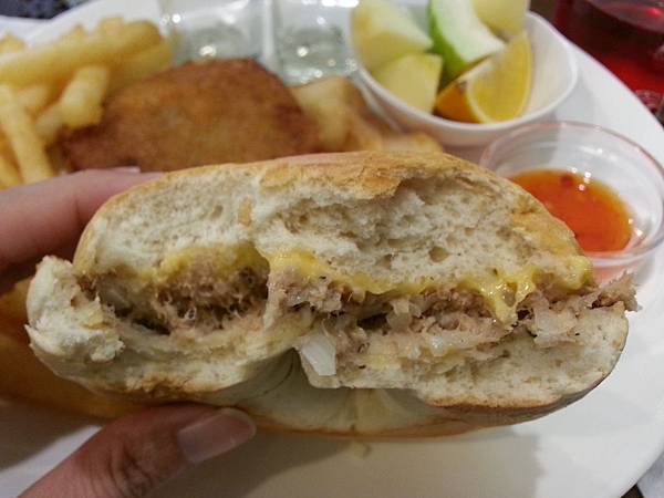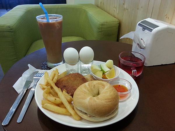 (多利魚+手工鮮蝦餅+洋蔥鮪魚起司貝果+水煮蛋+酥炸薯條) + 港式絲襪奶茶