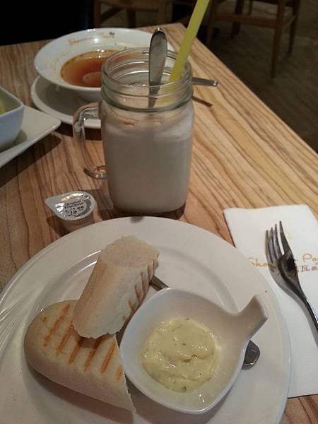 帕尼尼餅佐塔塔醬~搭配的醬好吃,2個麵包整個吃光,造成後面那盤義大利沒吃完只好外帶~ 鮮奶茶也不錯喝~