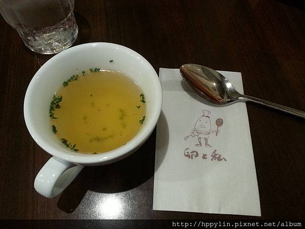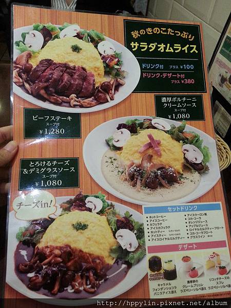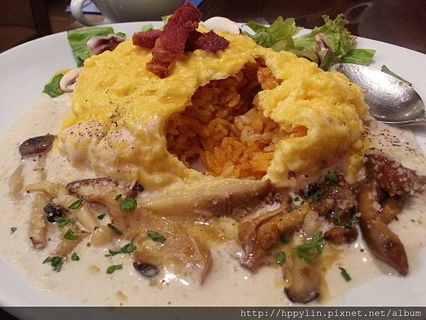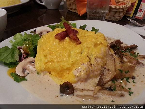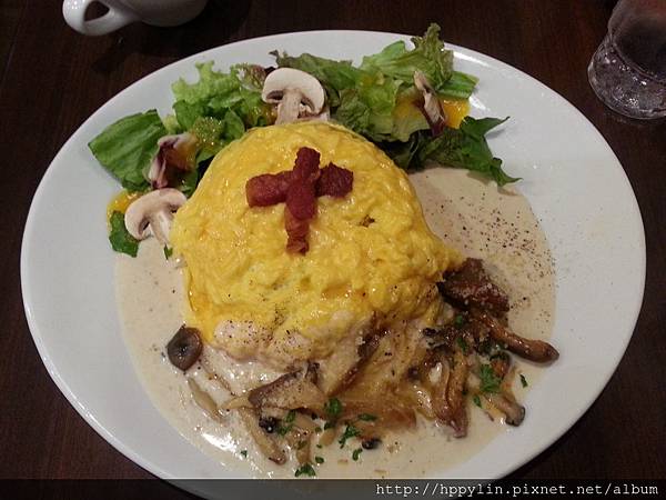 我點的有附湯的奶油白醬菇類蛋包飯,有好多種菇類且青菜也有,這盤吃光光~