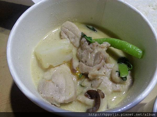 將那碗綠咖哩雞肉倒在飯上~料多實在,是雞肉片非雞肉絲