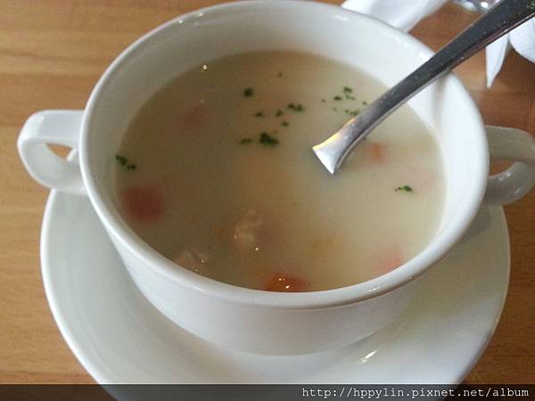 例湯-玉米濃湯,裏面的雞肉較大塊~