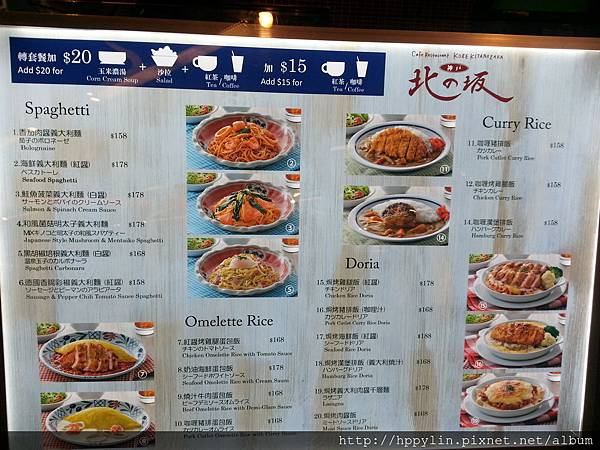 菜單,加$20就有套餐(湯、沙拉、飲料),加$15(就只有飲料)